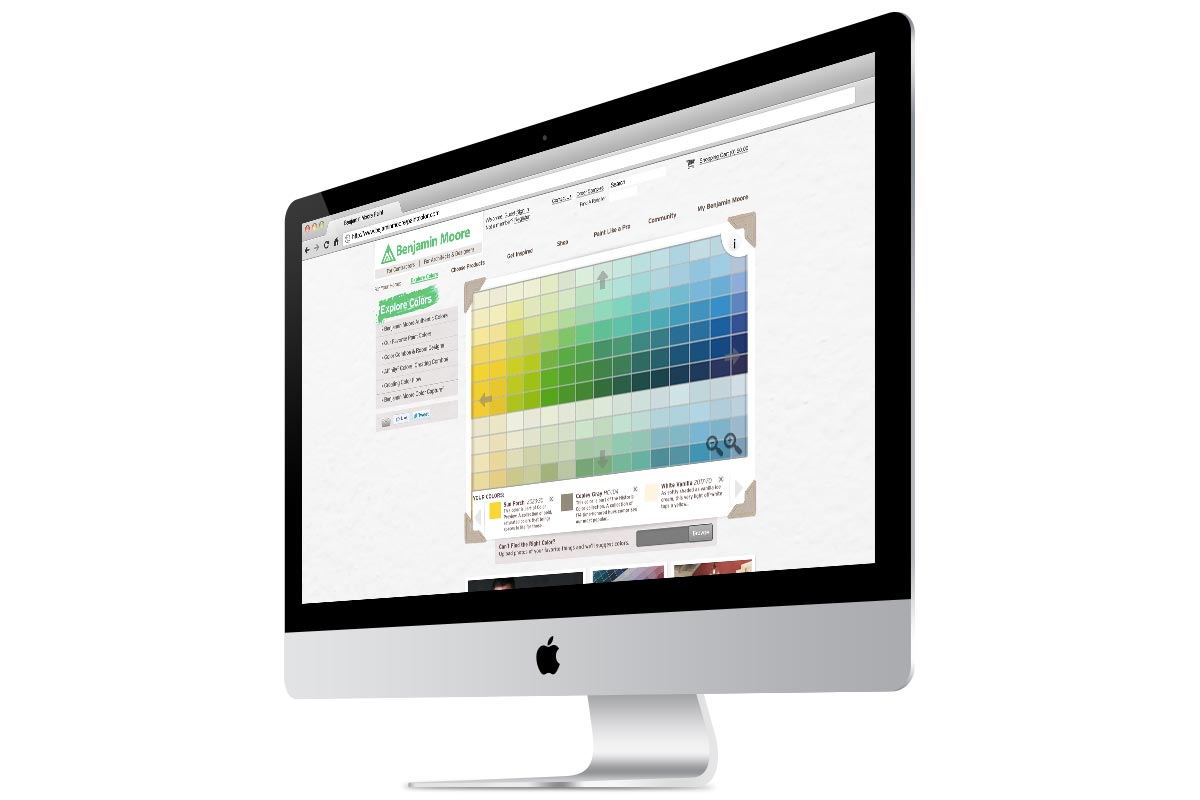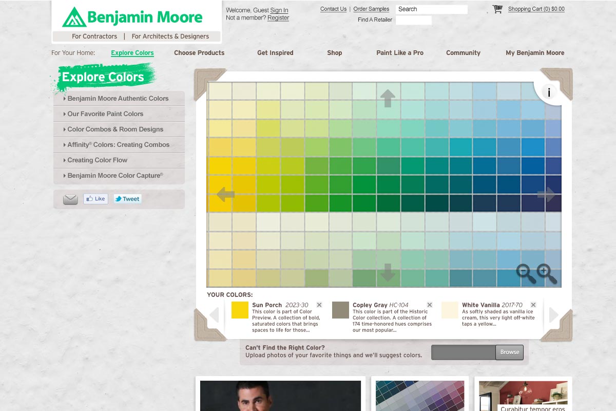 Establishing this online color tool required an in-depth survey of the existing site structure, look, and feel. Ultimately we chose to allow a viewer to start by selecting colors they were interested in using a drag and drop functionality. They could then navigate throughout the site with their selected colors to compare with other products.