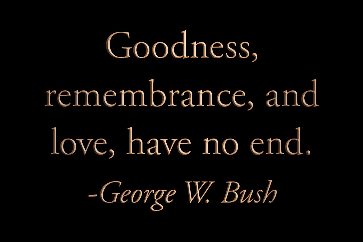 After several typographic explorations in search of a typeface and treatment that was both regal and impressive to match former President Bush's quote, Adobe's Garamond provided the visual voice with a brass/gold embossed look. Each word in this phrase was split into 6" tall metal print using a sublimation method.